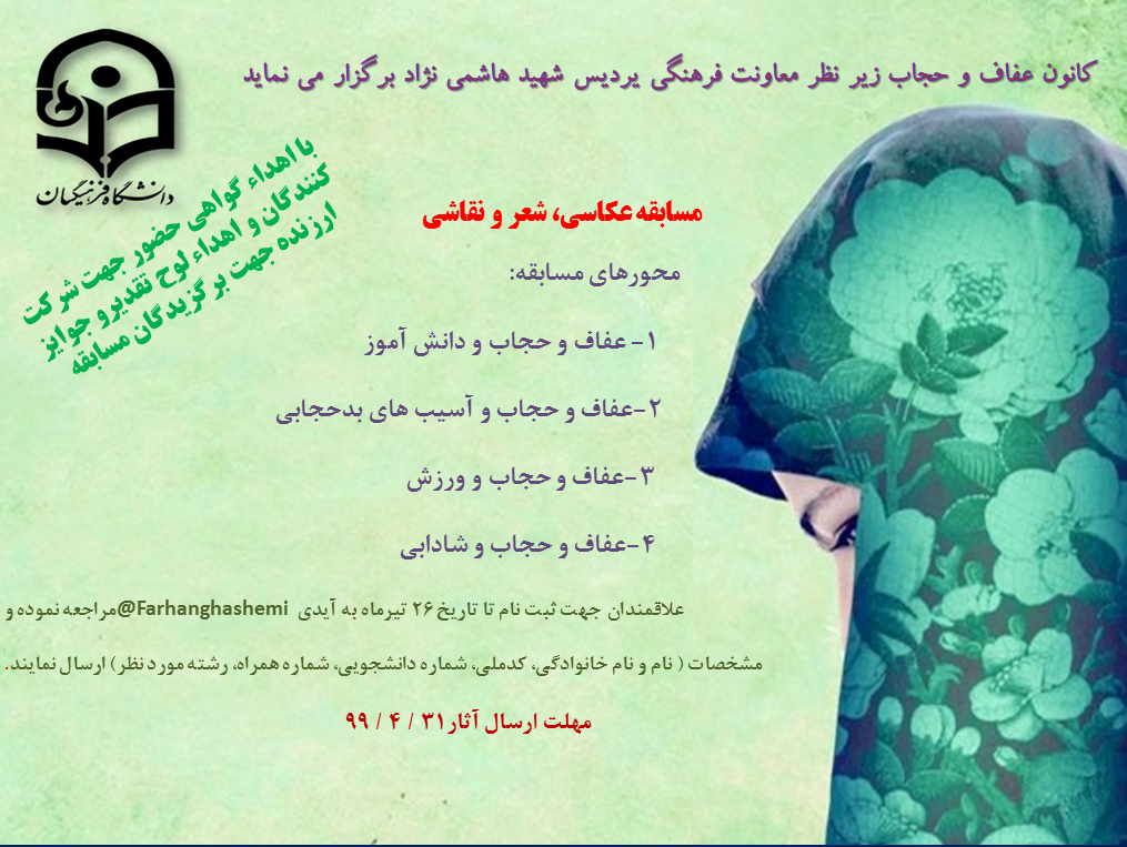 کانون عفاف و حجاب زیر نظر معاونت فرهنگی پردیس شهید هاشمی نژاد برگزار می کند: مسابقه عکاسی، شعر و نقاشی با ارائه گواهی حضور جهت شرکت کنندگان و اهداء لوح تقدیر و جوایز ارزنده جهت برگزیدگان مسابقه