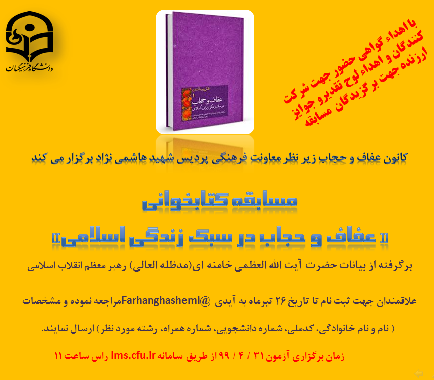 کانون عفاف و حجاب زیر نظر معاونت فرهنگی پردیس شهید هاشمی نژاد برگزار می کند: مسابقه کتابخوانی " عفاف و حجاب در سبک زندگی اسلامی" با ارائه گواهی حضور جهت شرکت کنندگان و اهداء لوح تقدیر و جوایز ارزنده جهت برگزیدگان مسابقه