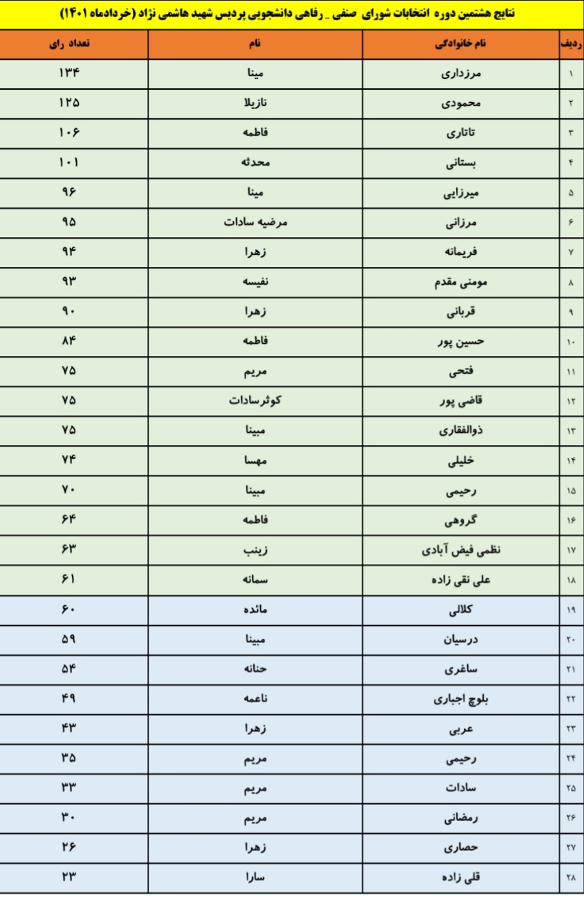 نتایج هشتمین دوره انتخابات شورای صنفی-رفاهی دانشجویی پردیس شهید هاشمی نژاد