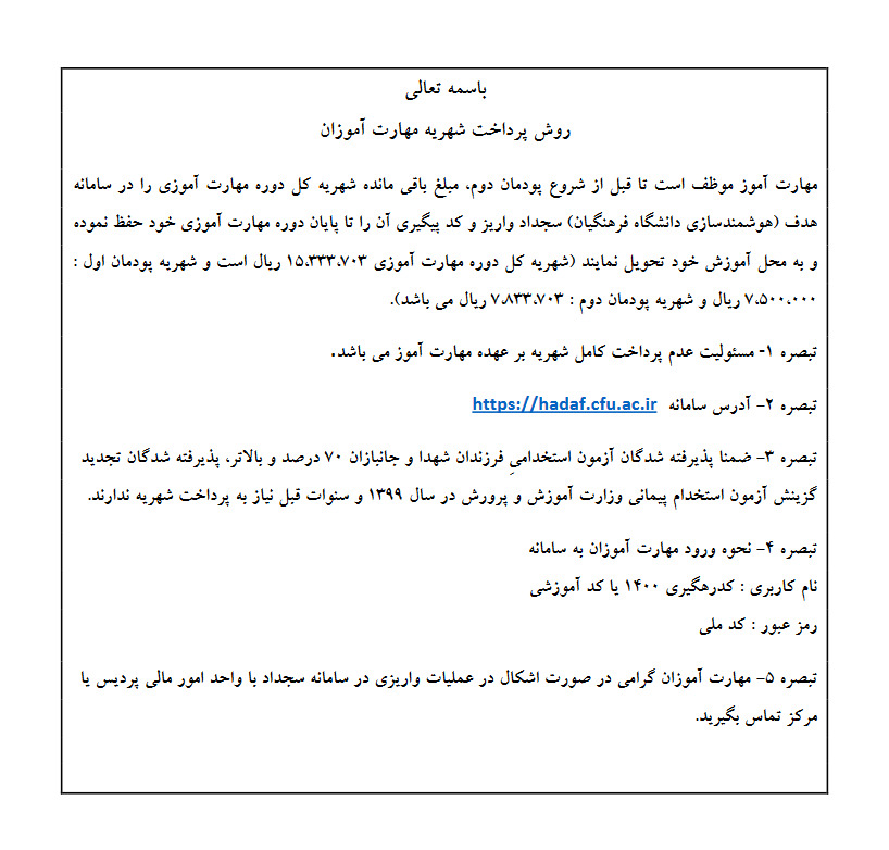 با توجه به اتمام دوره مهارت آموزی سری اول و ضرورت تسویه حساب شهریه پودمان اول ( 7500000 ریال) و