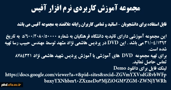 مجموعه آموزش کاربردی نرم افزار آفیس -برای تهیه مجموعه DVD های آموزشی با آموزش پردیس شهید هاشمی نژاد 8784321 تماس حاصل نمائید.