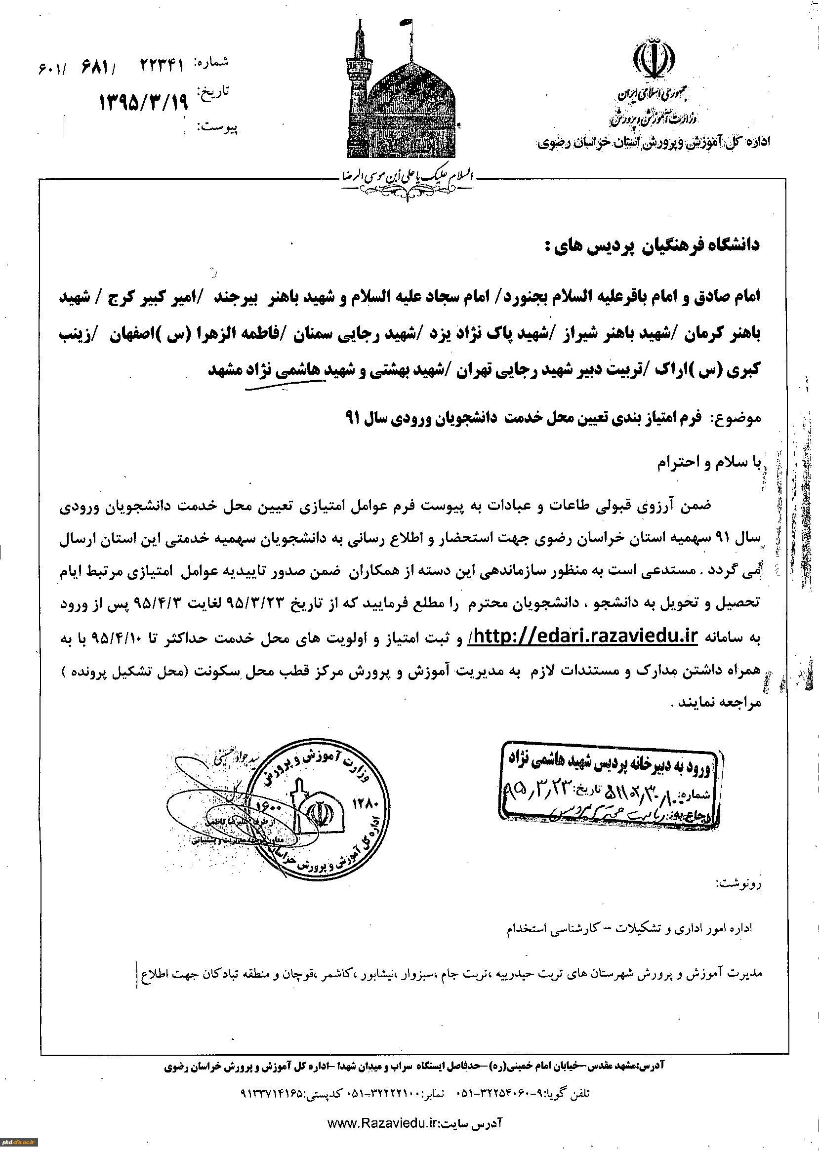 تکمیل فرم امتیاز بندی دانشجو معلمان ورودی 91