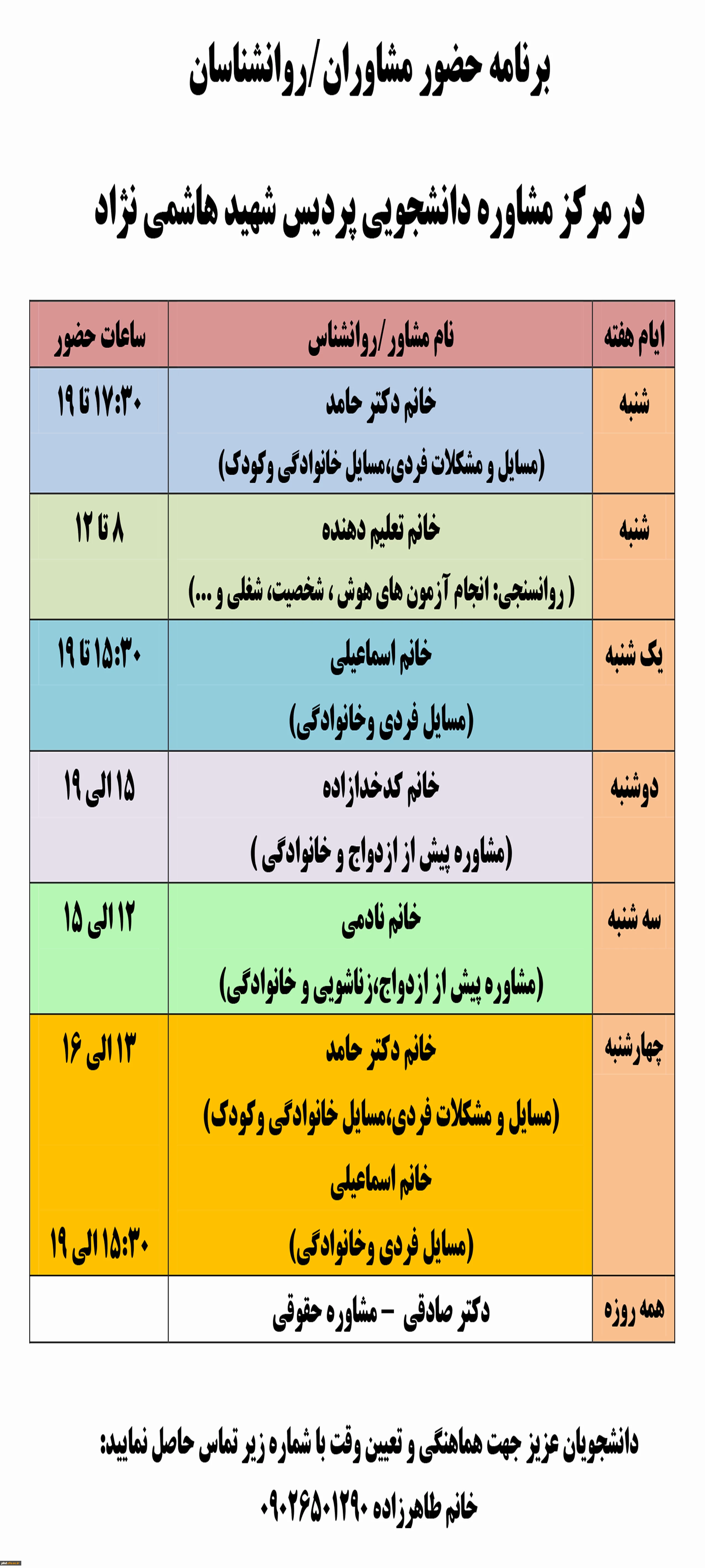 امتیاز دهید : برنامه زمانبندی حضور مشاوران در مرکز مشاوره پردیس شهید هاشمی نژاد یکشنبه 29 مهر 1397 ساعت 10:57