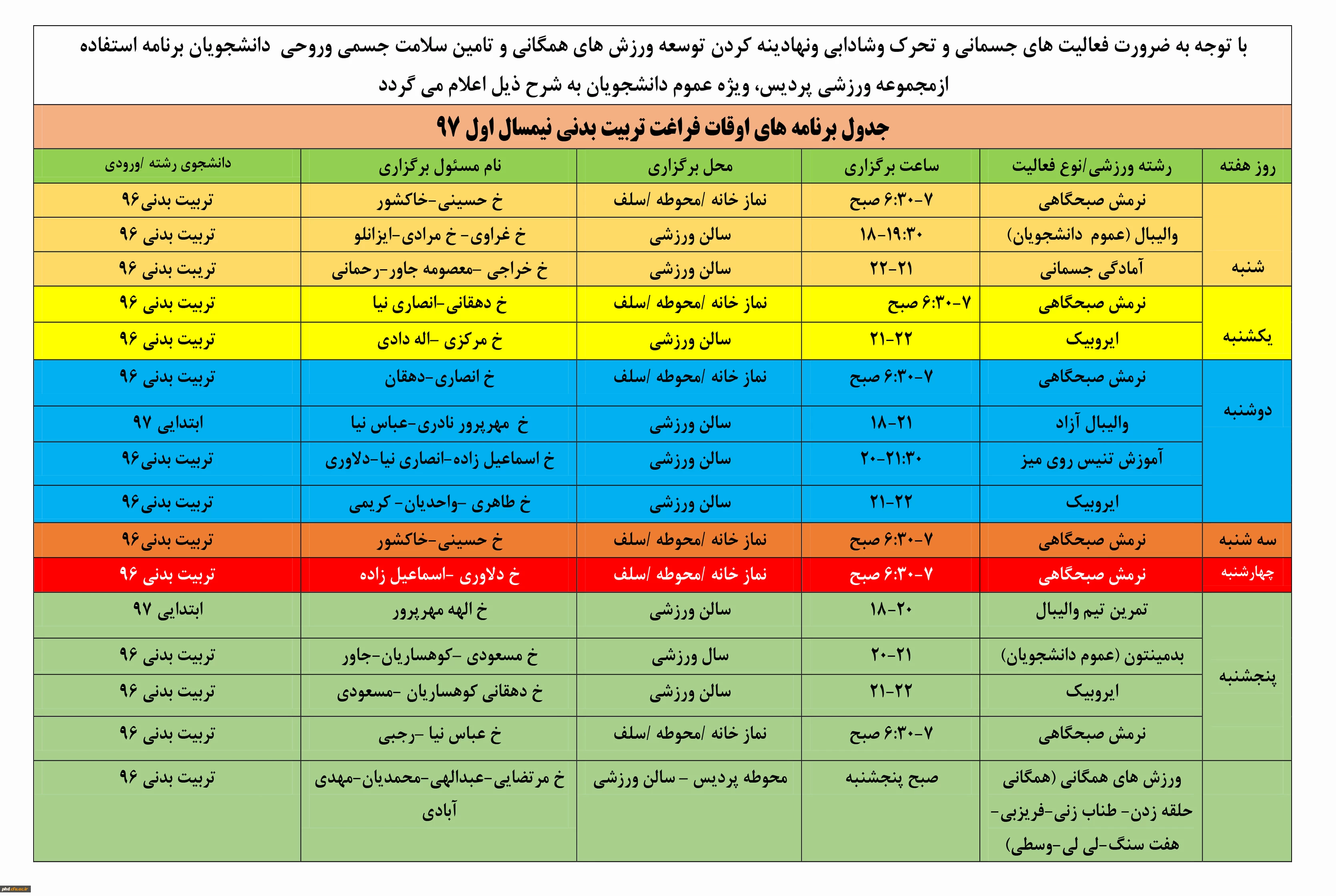 برنامه زمانبندی اوقات فراغت سالن ورزشی اما رضا(ع)