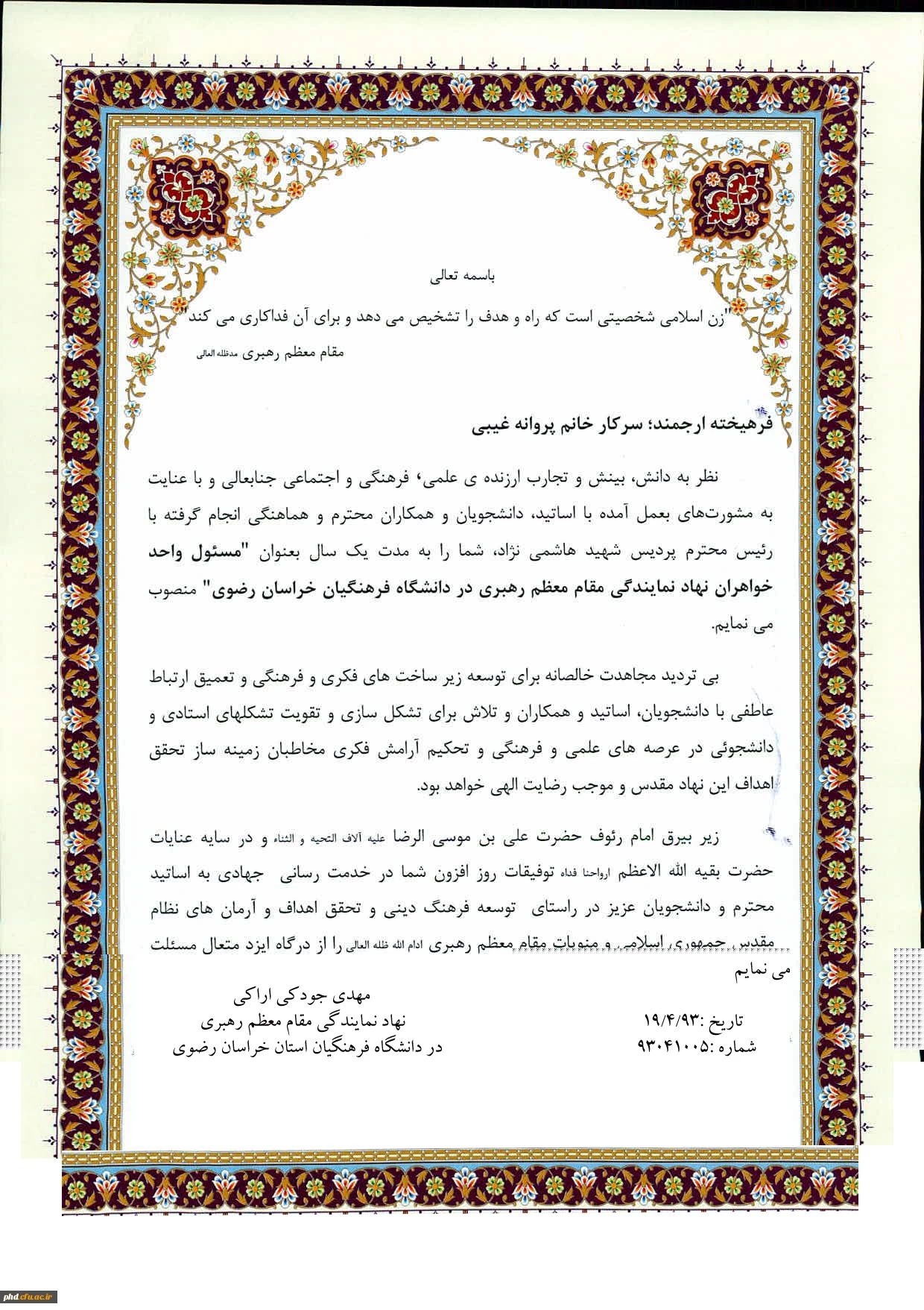 اتصاب مسئول واحد خواهران نمایندگی مقام معظم رهبری