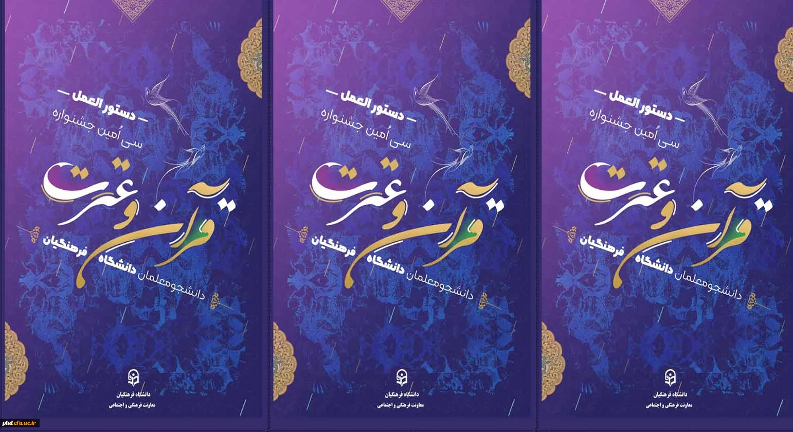 دستورالعمل برگزاری سی امین جشنواره فرهنگی قرآن و عترت جهت دریافت دستورالعمل به لینک زیر مراجعه شود https://phd.cfu.ac.ir/fa/163269
