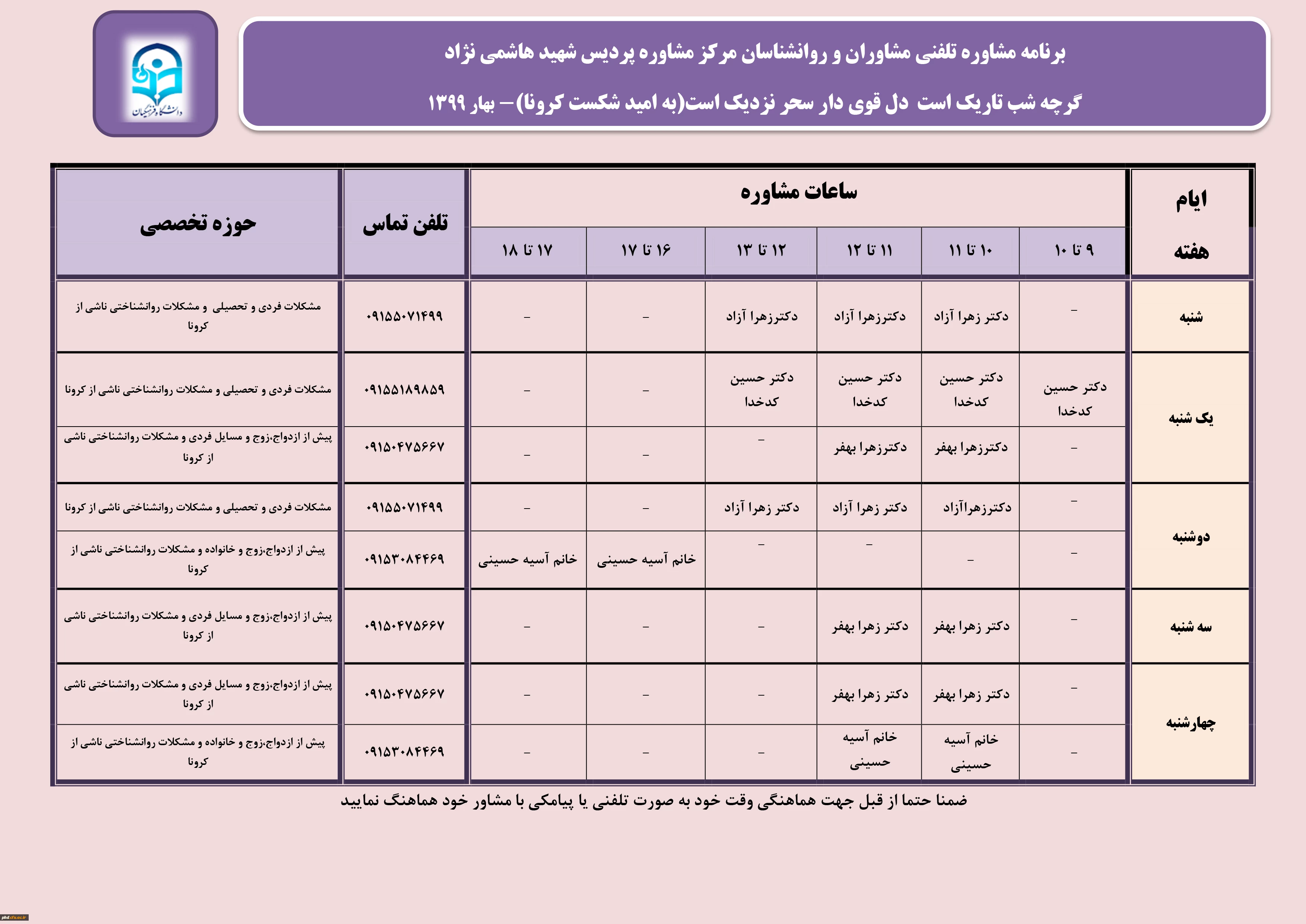 برنامه پاسخگویی مشاوران وروانشناسان مرکز مشاوره پردیس شهید هاشمی نژاد