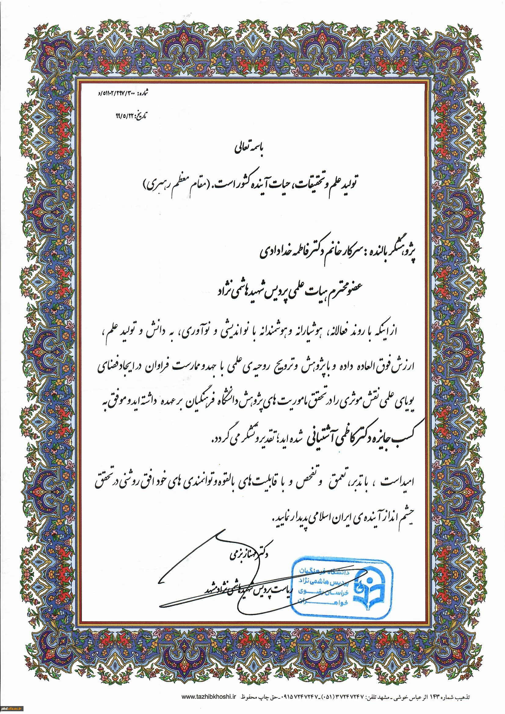 موفقیت افتخار آمیز عضو محترم هیات علمی پردیس شهیدهاشمی نژاد سرکار خانم دکتر فاطمه خدادادی در کسب جایزه دکتر کاظمی آشتیانی . 4