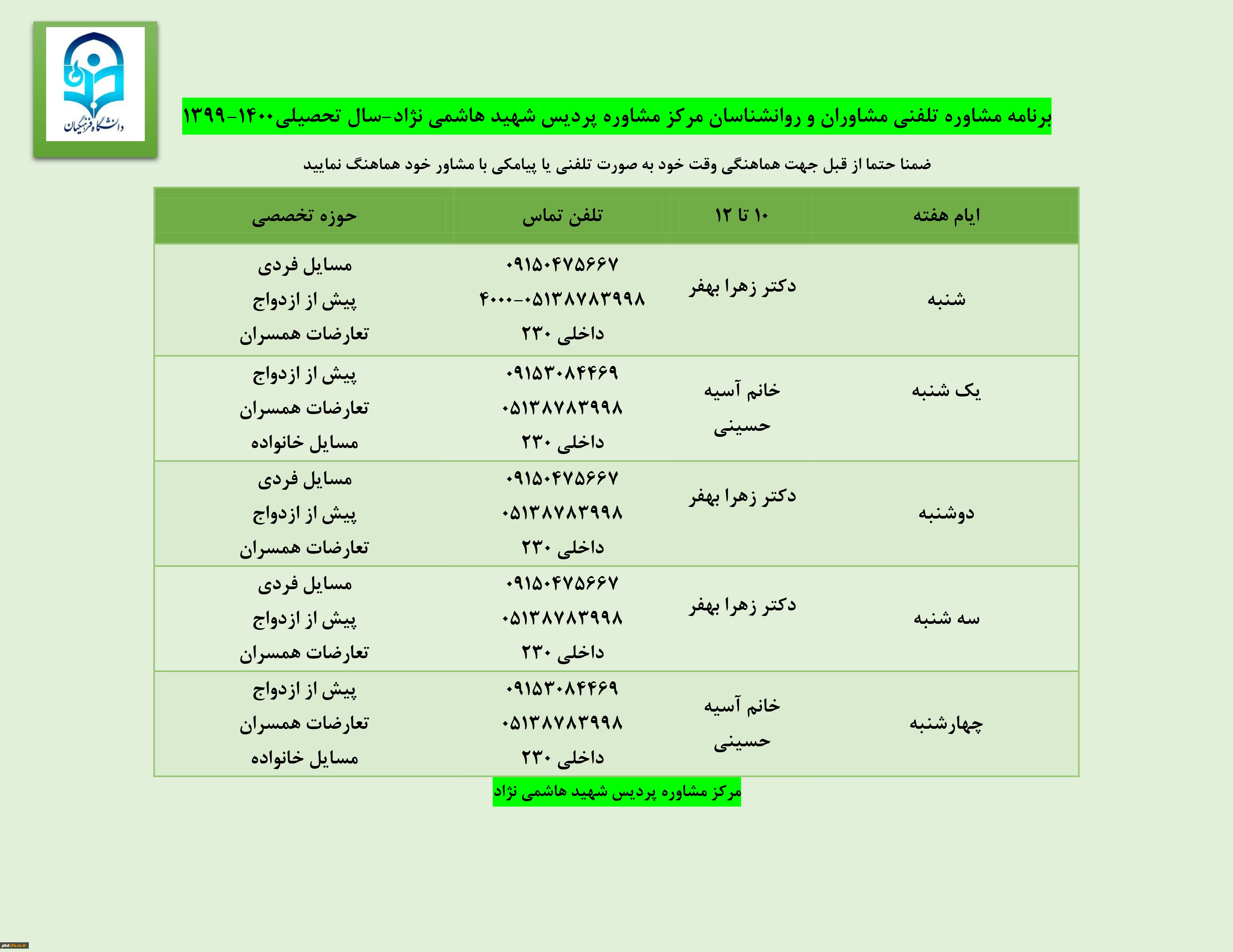 برنامه مشاوره تلفنی مشاوران و روانشناسان مرکز مشاوره پردیس شهید هاشمی نژاد-سال تحصیلی1400-1399