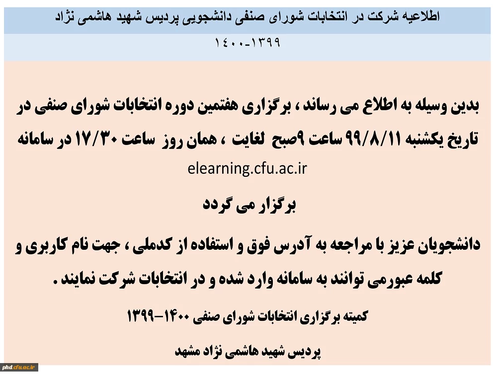امتیاز دهید : اطلاعیه شرکت در انتخابات شورای صنفی دانشجویی پردیس شهید هاشمی نژاد شنبه 10 آبان 1399 ساعت 17:38