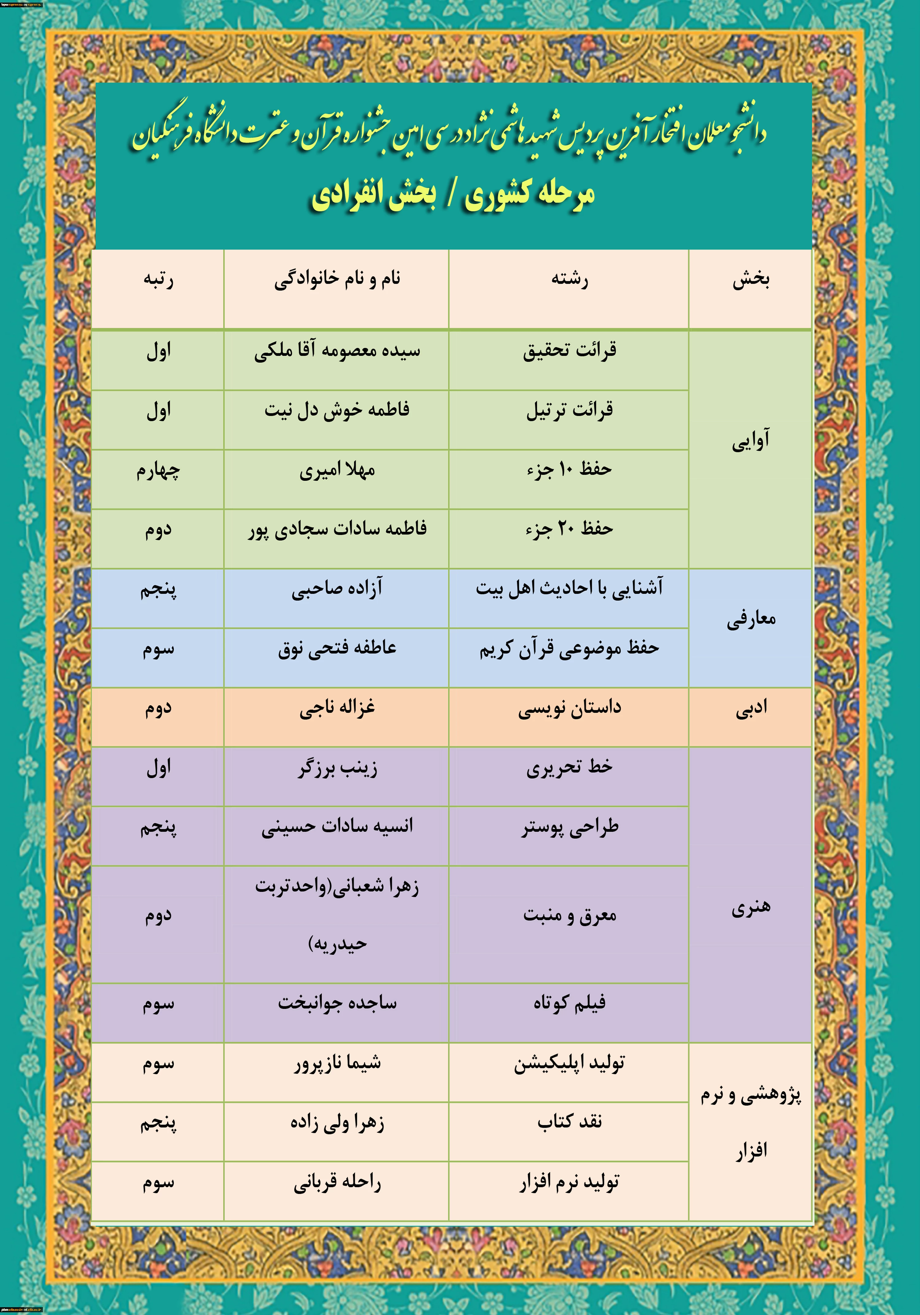 دانشجومعلمان افتخار آفرین پردیس شهید هاشمی نژاد در سی امین جشنواره قرآن و عترت دانشگاه فرهنگیان
