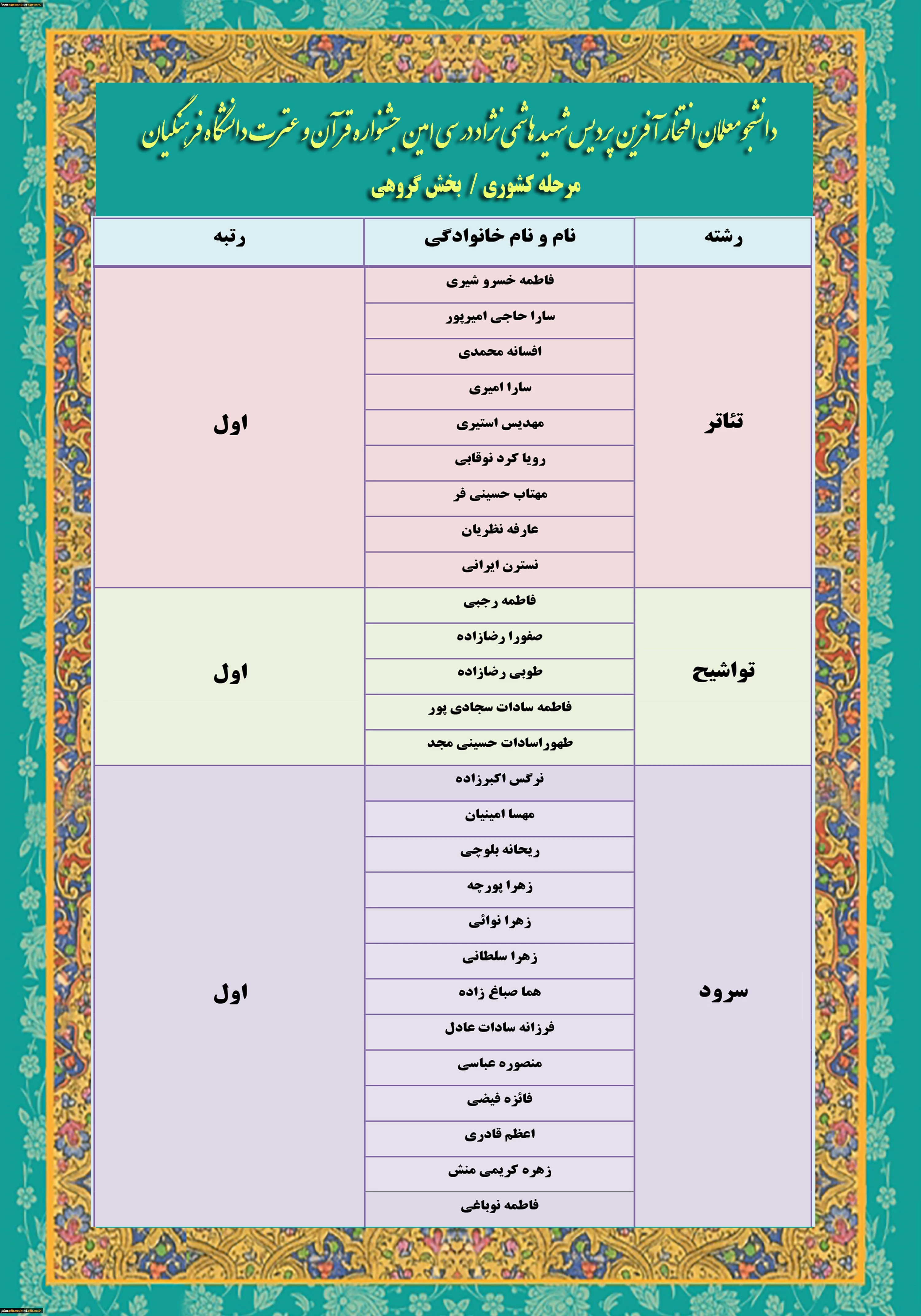 دانشجومعلمان افتخار آفرین پردیس شهید هاشمی نژاد در سی امین جشنواره قرآن و عترت دانشگاه فرهنگیان