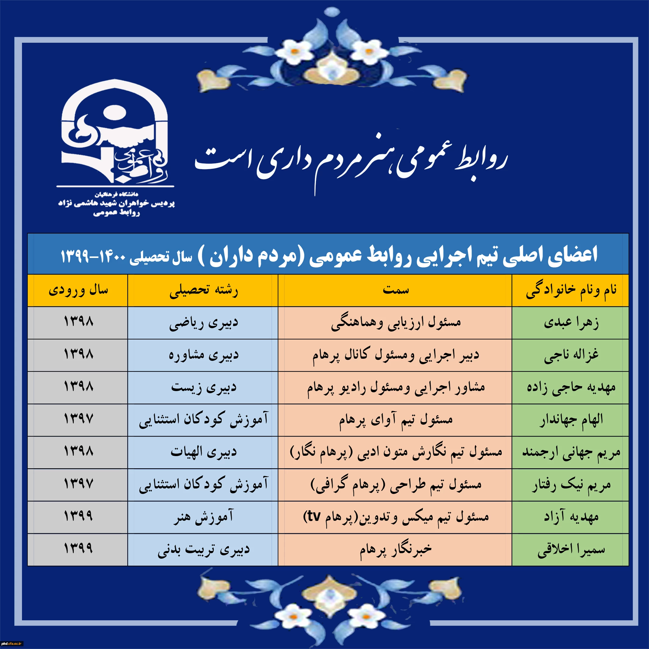 امتیاز دهید : اعضای سر تیم های اجرایی روابط عمومی (مردم داران ) –سال تحصیلی 1399-1400 دوشنبه 22 دی 1399 ساعت 9:22