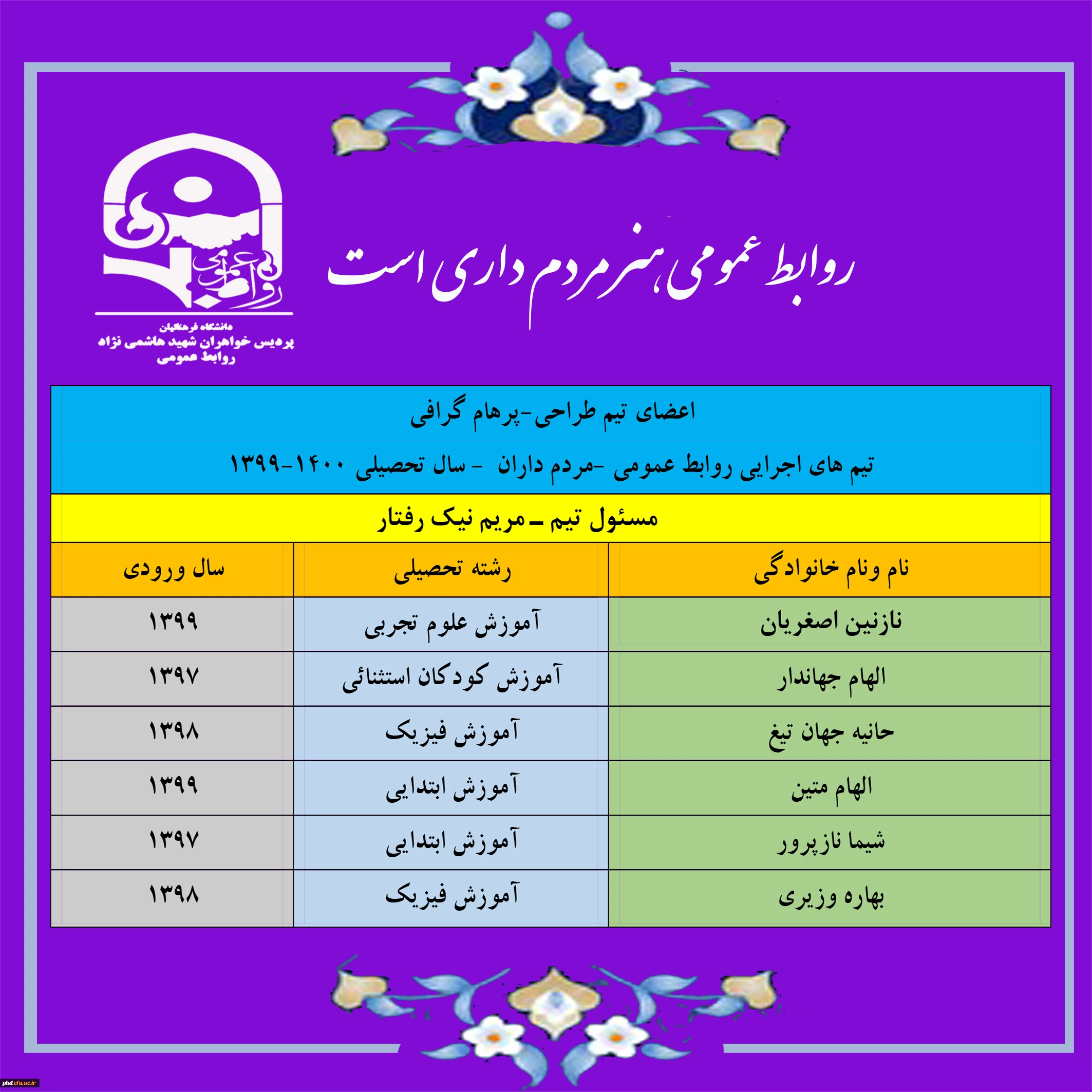 اعضای تیم طراحی(پرهام گرافی) تیم های اجرایی روابط عمومی (مردم داران ) –سال تحصیلی 1399-1400