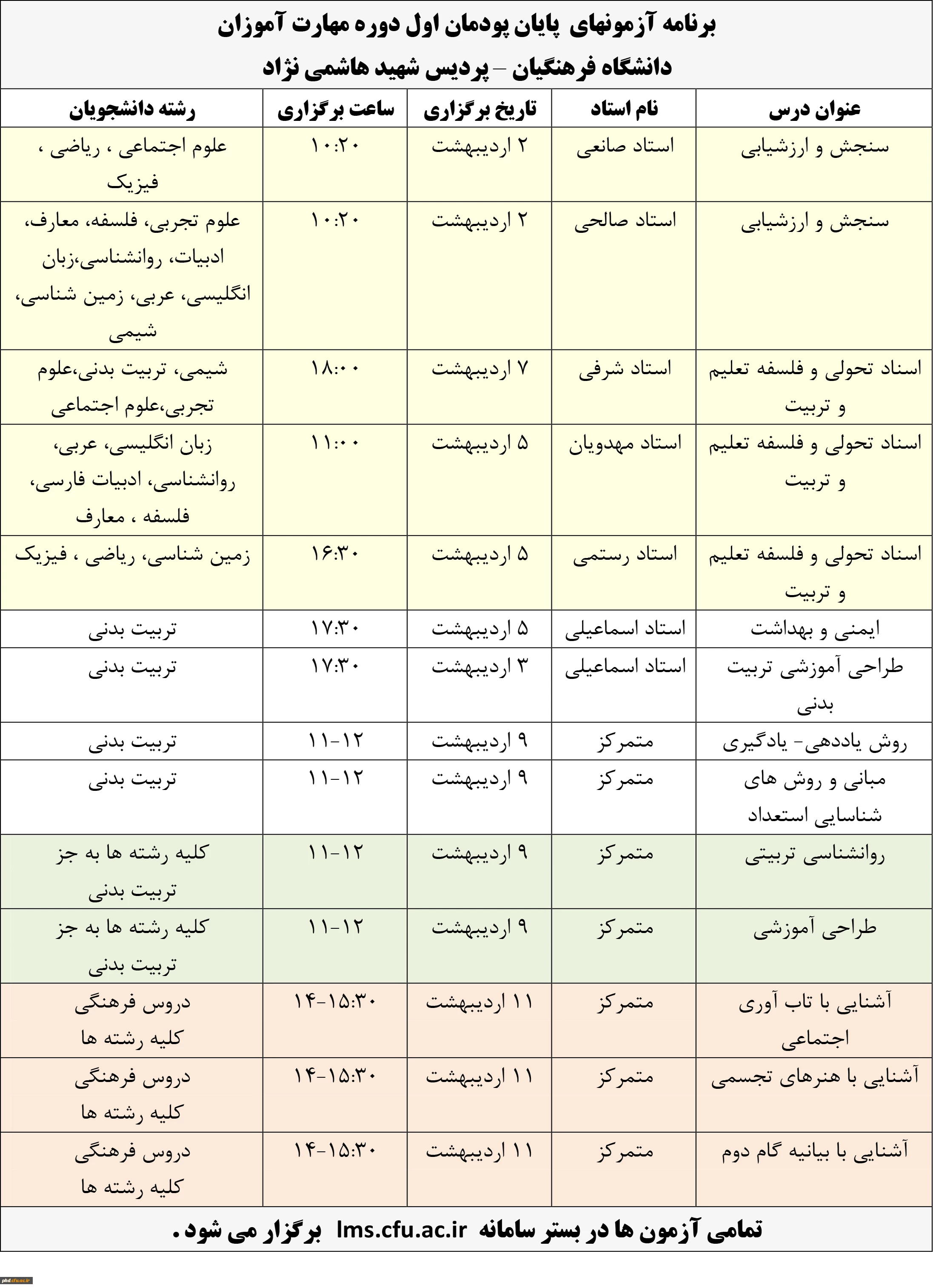 برنامه آزمونهای پایان پودمان اول دوره مهارت آموزان دانشگاه فرهنگیان – پردیس شهید هاشمی نژاد