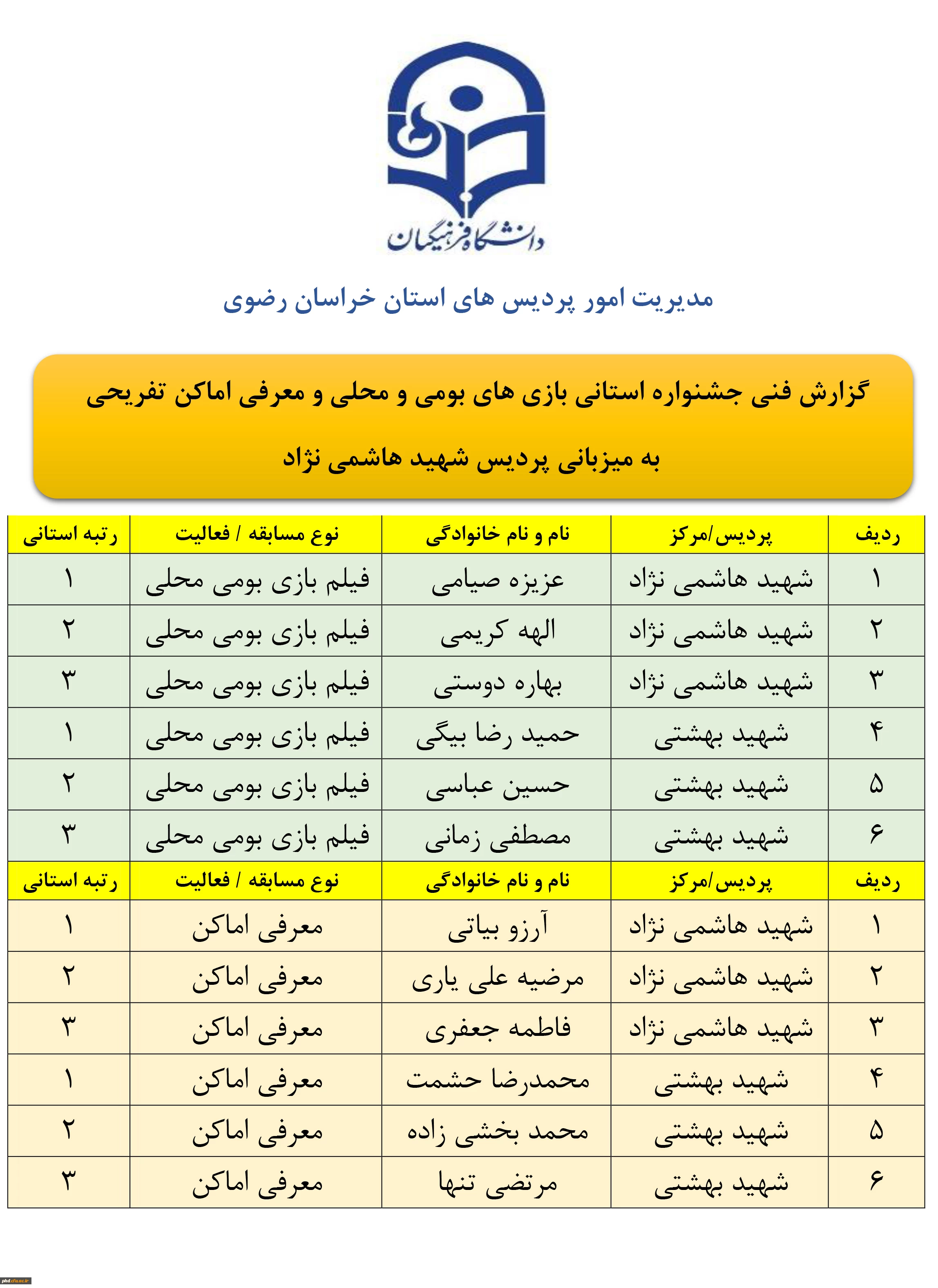 گزارش فنی جشنواره استانی بازی های بومی و محلی و معرفی اماکن تفریحی به میزبانی پردیس شهید هاشمی نژاد