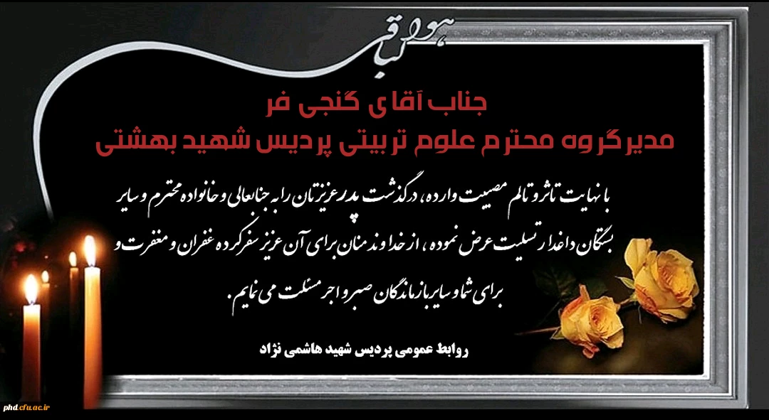 امتیاز دهید : پیام تسلیت به جناب آقای گنجی فر مدیرگروه محترم علوم تربیتی پردیس شهید بهشتی 2 شنبه 22 آبان 1400 ساعت 10:26
