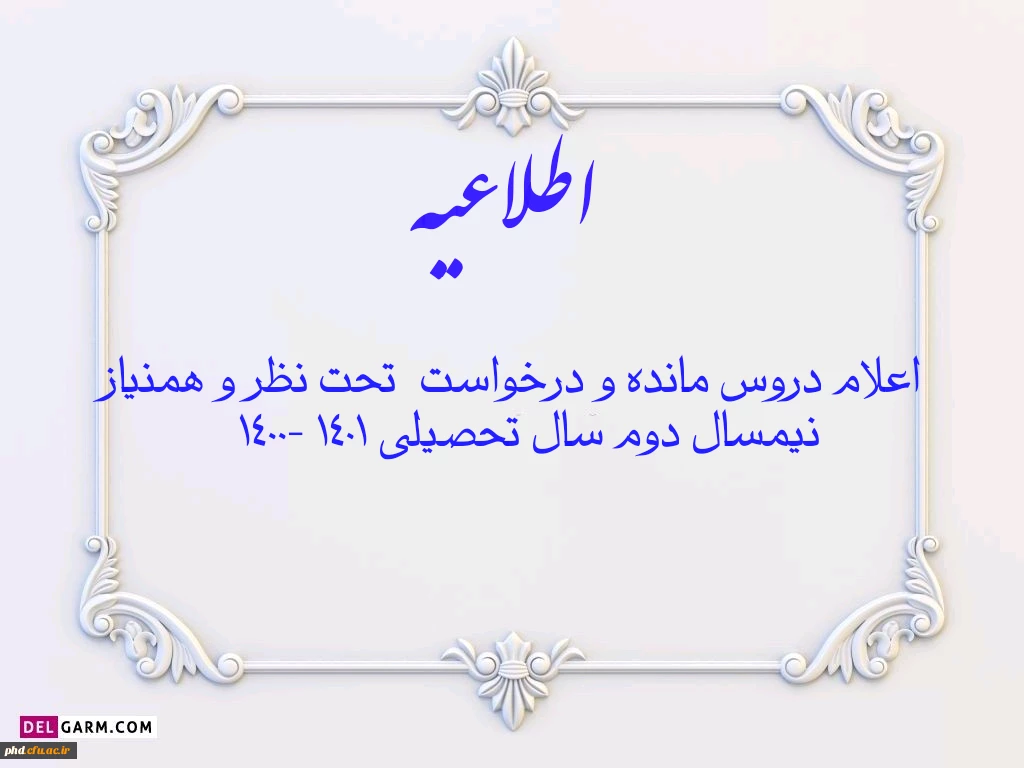 امتیاز دهید : اعلام دروس مانده و درخواست تحت نظر و همنیاز نیمسال دوم سال تحصیلی 1401 -1400 4 یکشنبه 19 دی 1400 ساعت 9:53