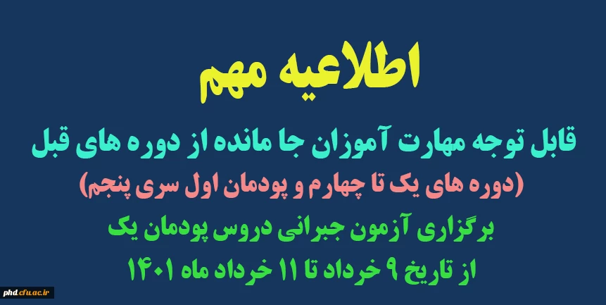 امتیاز دهید : برگزاری آزمون جبرانی دروس پودمان یک ، از تاریخ 9 خرداد تا 11 خرداد ماه 1401 2 چهارشنبه 4 خرداد 1401 ساعت 20:07