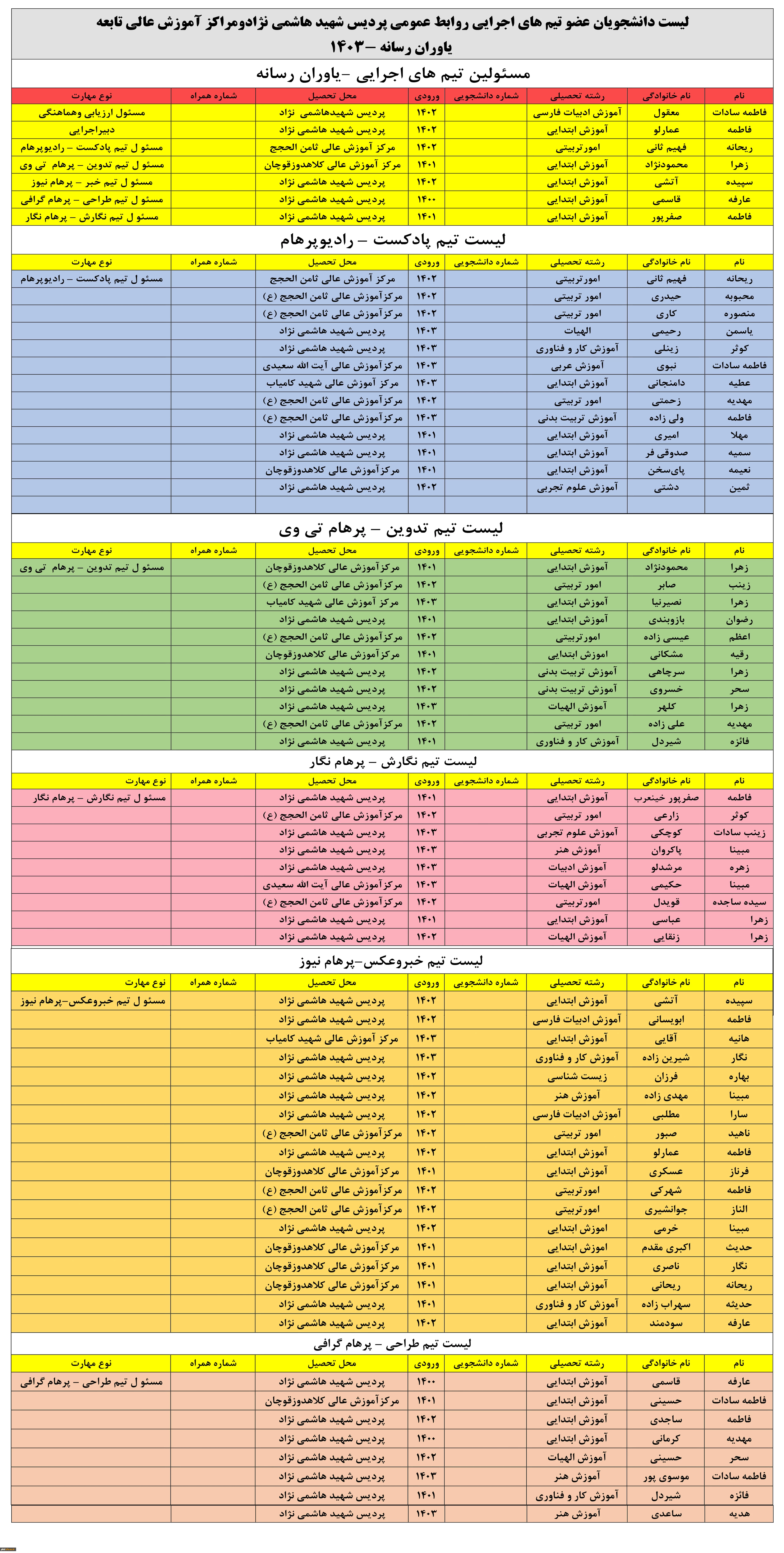 لیست دانشجومعلمان تیم اجرایی روابط عمومی -سال 1403