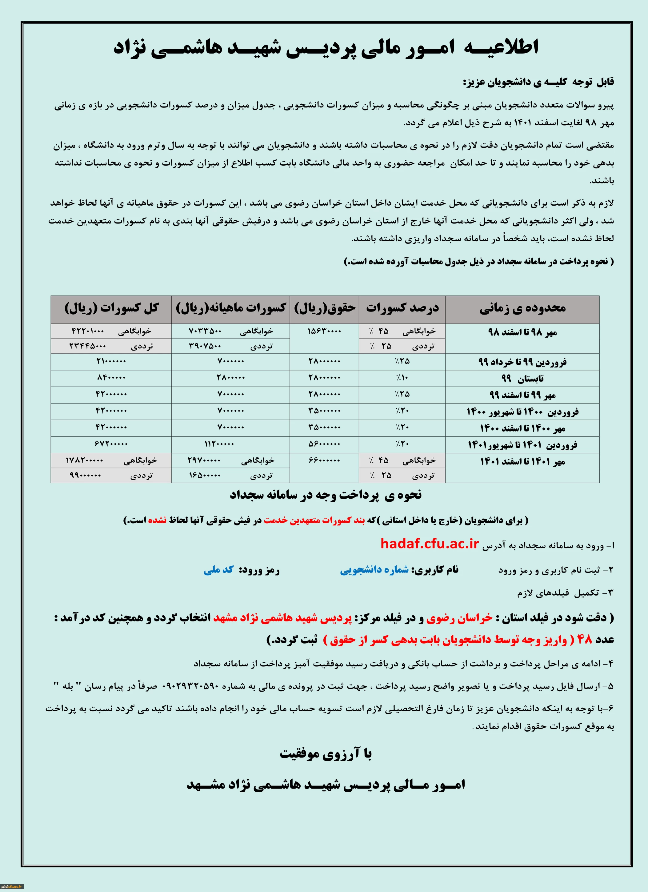 امتیاز دهید : دانشجویان عزیز طبق این فایل می توانید نسبت به پرداخت کسورات خود اقدام بفرمایید چهارشنبه 21 دی 1401 ساعت 17:31
