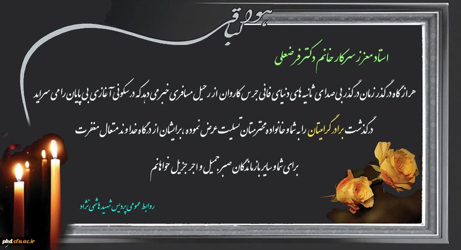 امتیاز دهید : پیام تسلیت به سرکارخانم دکتر فرضعلی استاد معزز پردیس شهید هاشمی نژاد یکشنبه 7 اسفند 1401 ساعت 11:38