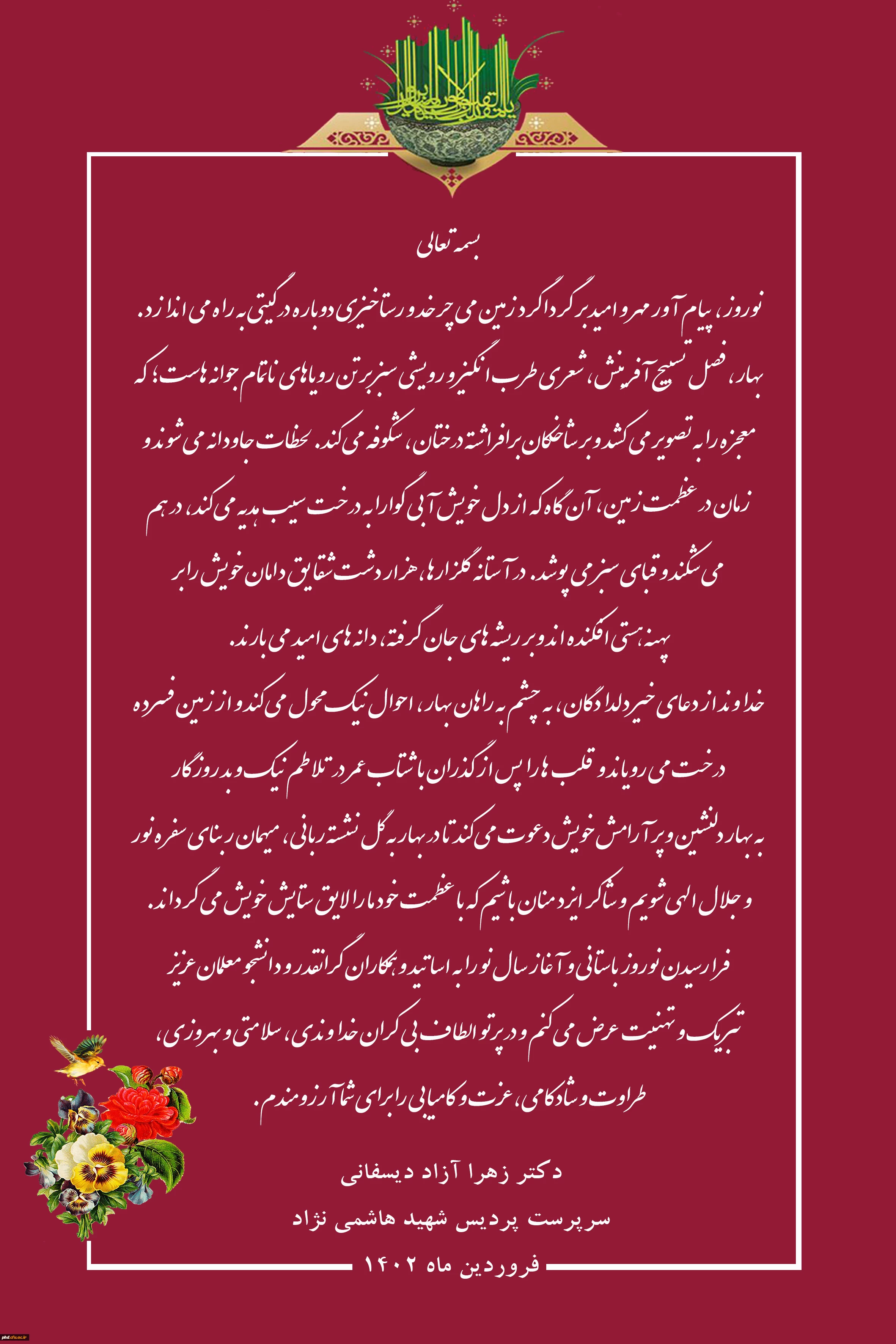 امتیاز دهید : پیام نوروزی دکتر آزاد دیسفانی سرپرست پردیس شهید هاشمی نژاد دوشنبه 22 اسفند 1401 ساعت 21:57