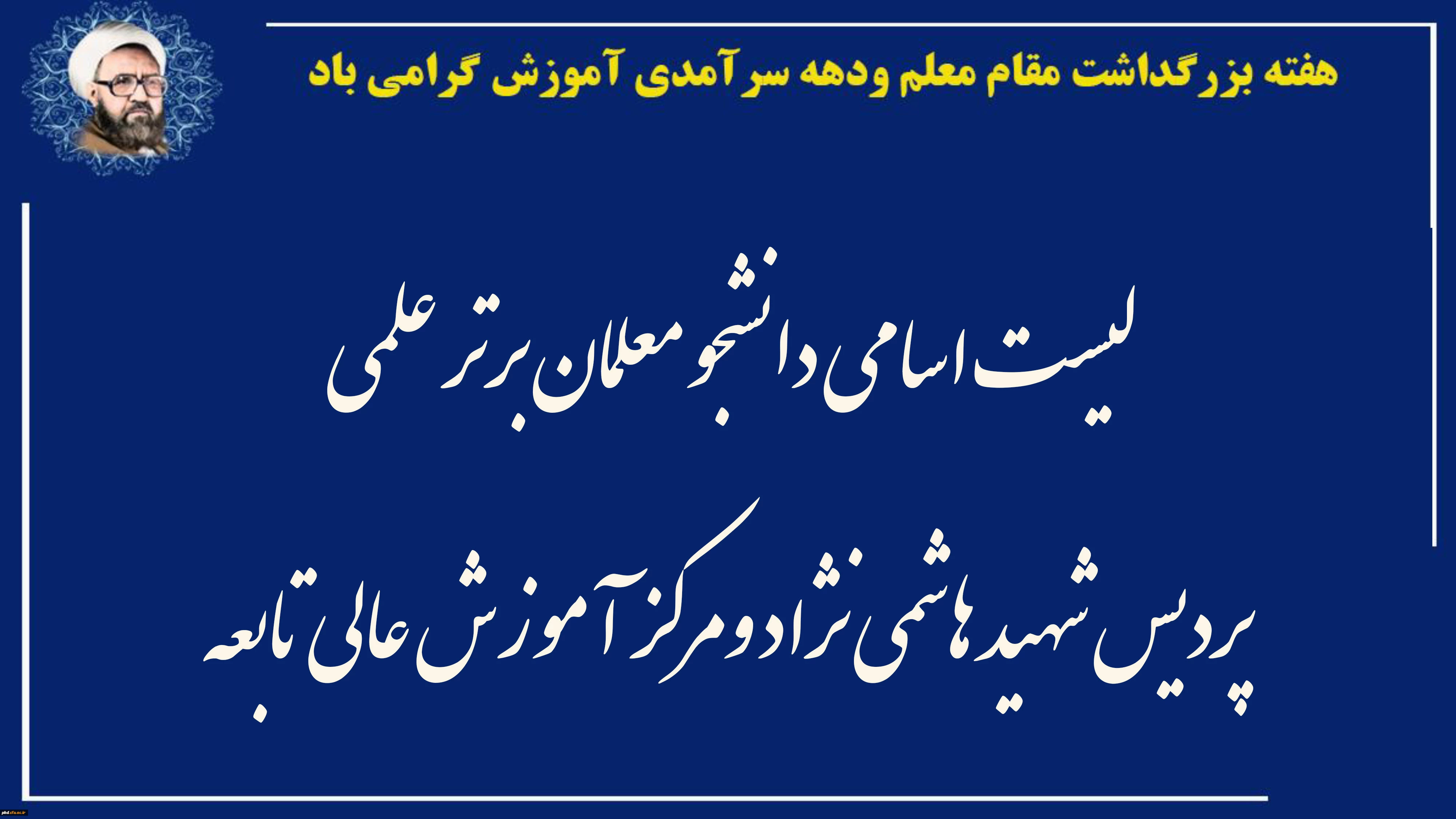 امتیاز دهید : لیست اسامی دانشجو معلمان برتر علمی پردیس شهید هاشمی نژاد ومرکز آموزش عالی تابعه 2 پنجشنبه 14 اردیبهشت 1402 ساعت 21:27