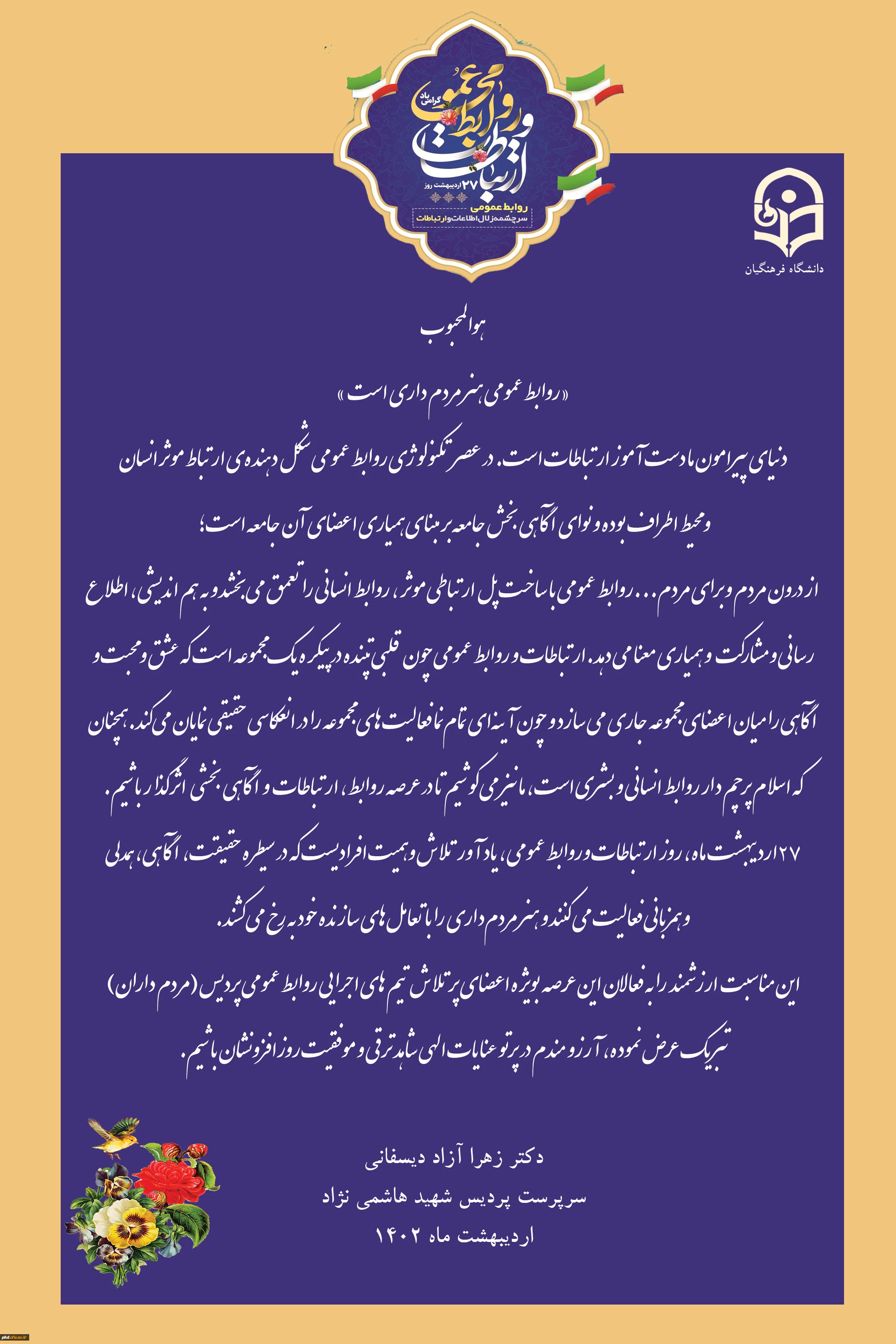 پیام سرپرست پردیس شهید هاشمی نژاد به مناسبت گرامیداشت روز جهانی ارتباطات و روابط عمومی