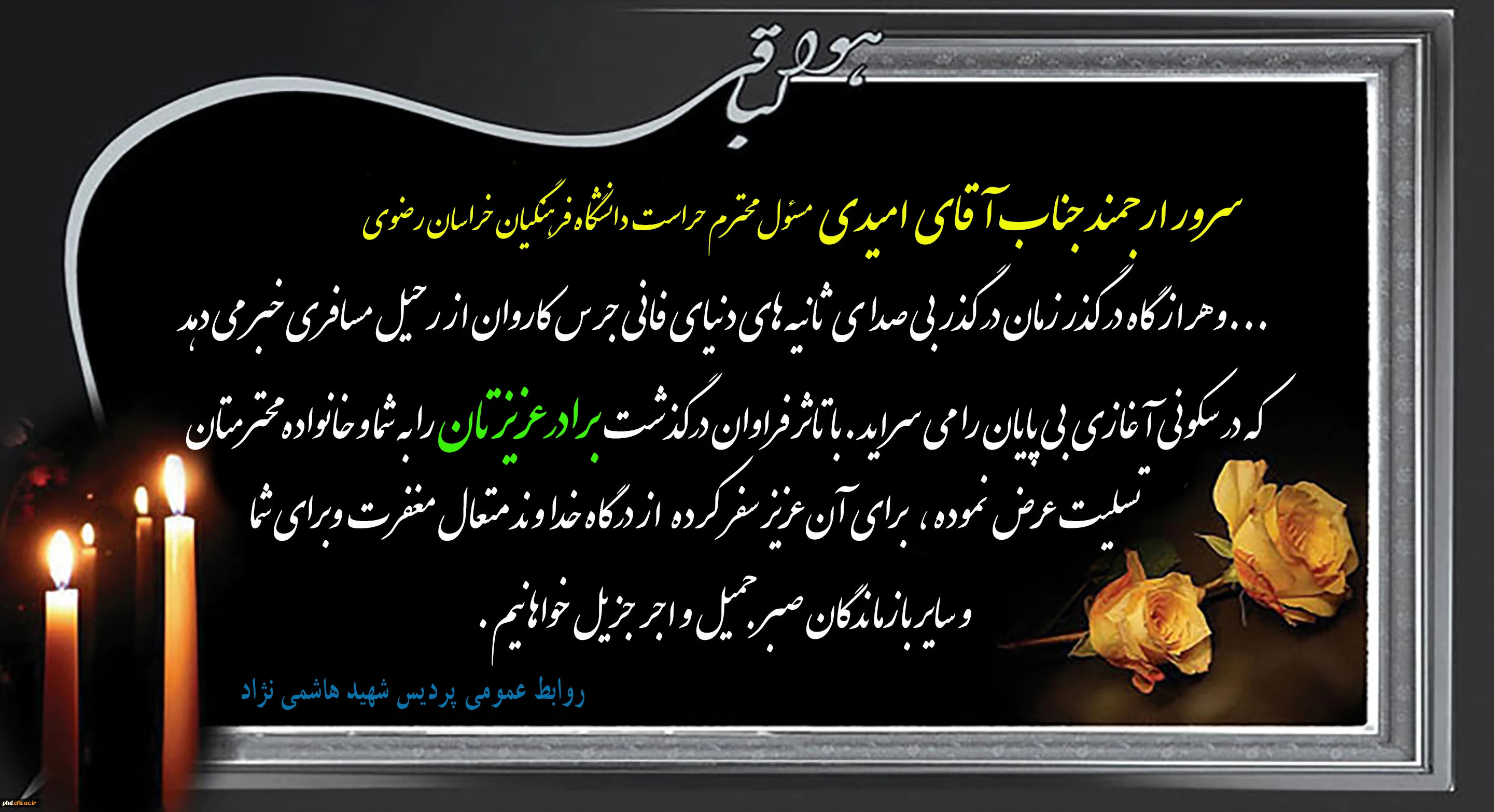 امتیاز دهید : عرض تسلیت به جناب آقای امیدی مسئول محترم حراست دانشگاه فرهنگیان خراسان رضوی سهشنبه 9 خرداد 1402 ساعت 23:53