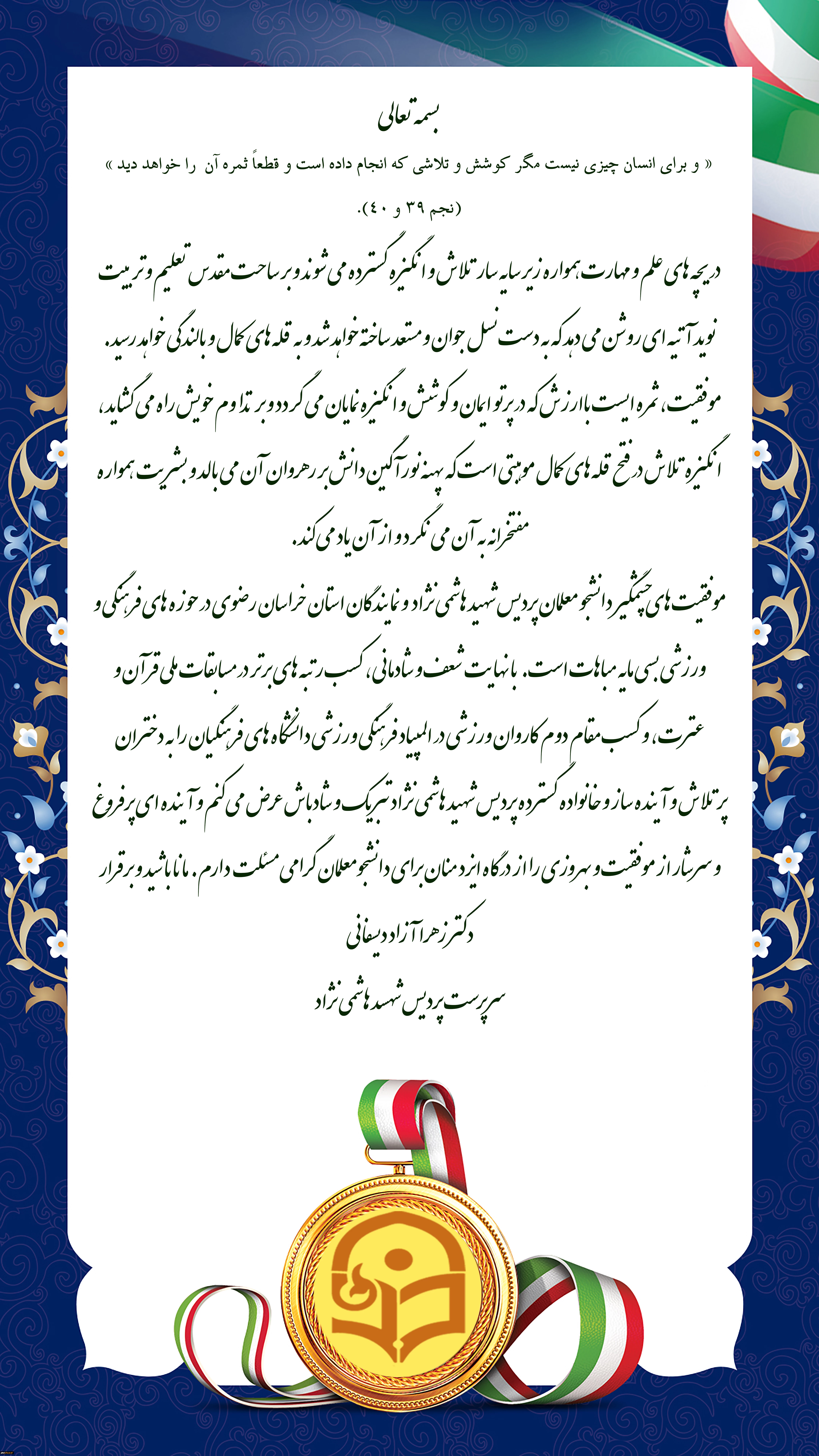 پیام تبریک سرپرست پردیس شهید هاشمی نژاد به مناسبت کسب رتبه های برتر فرهنگی وورزشی دانشجو معلمان در المپیاد های کشوری