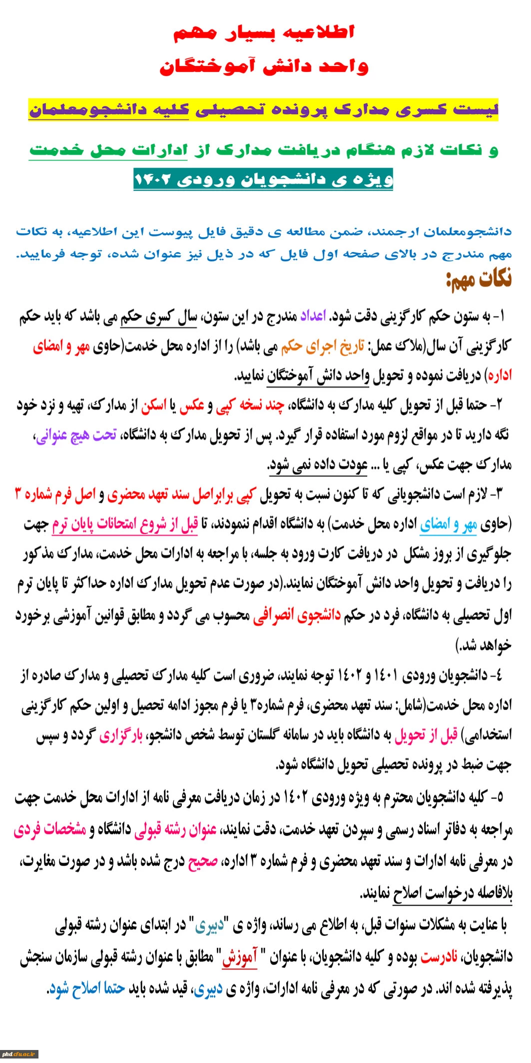 لیست کسری مدارک پرونده تحصیلی کلیه دانشجومعلمان