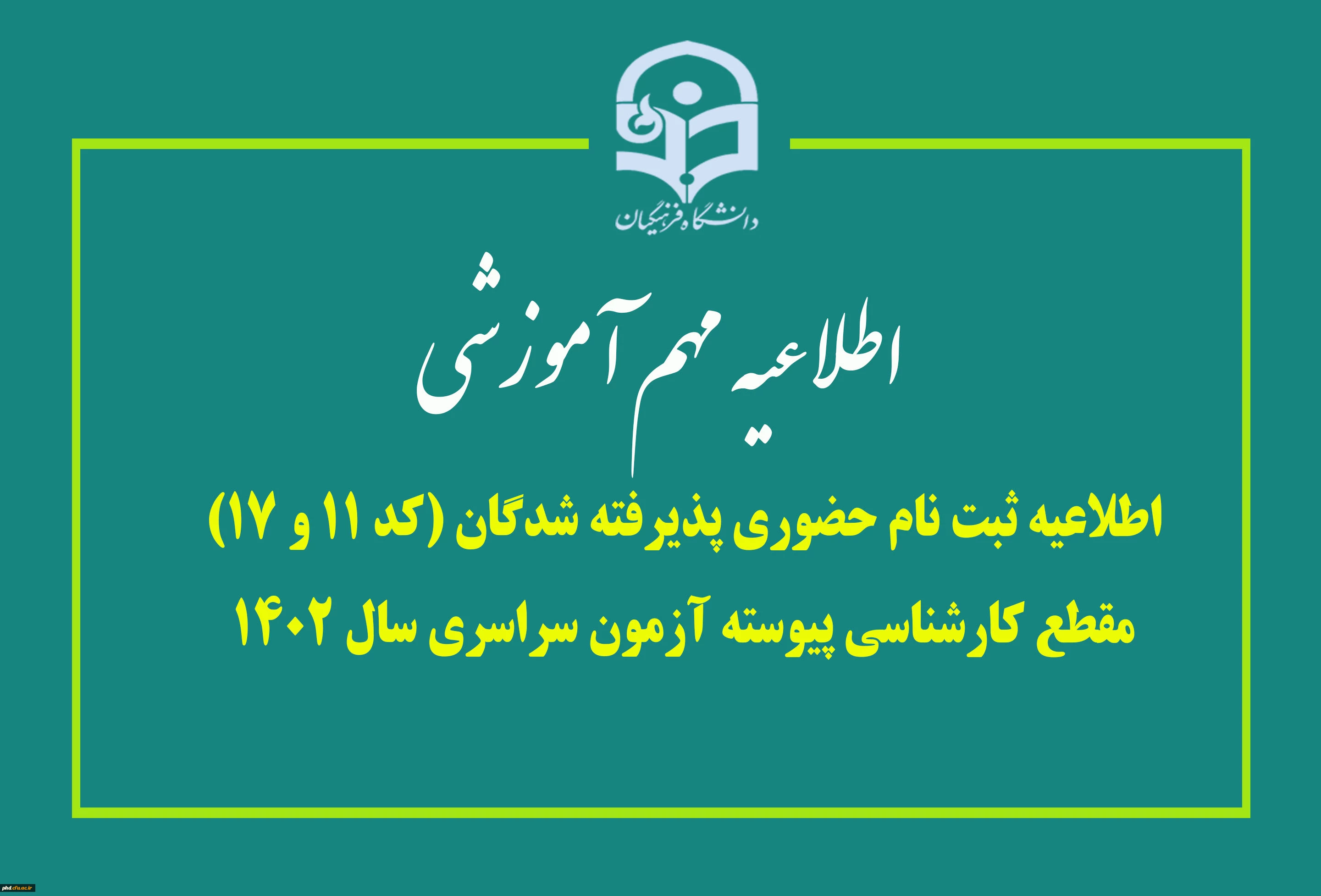 امتیاز دهید : ثبت نام حضوری پذیرفته شدگان (کد 11 و 17) مقطع کارشناسی پیوسته آزمون سراسری سال 1402 2 شنبه 2 دی 1402 ساعت 17:56