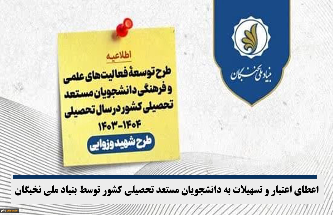 امتیاز دهید : اعطای اعتبار و تسهیلات به دانشجویان مستعد تحصیلی کشور توسط بنیاد ملی نخبگان 2 سهشنبه 22 آبان 1403 ساعت 12:32