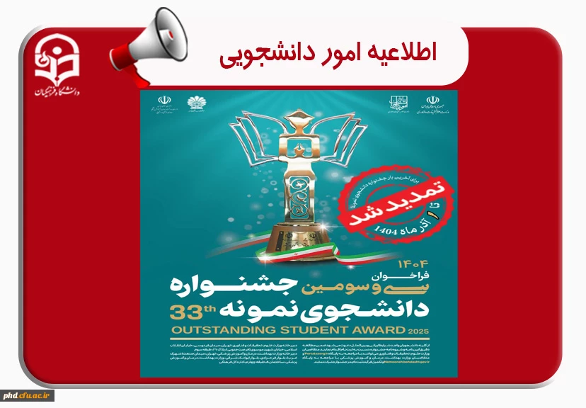 امتیاز دهید : ثبت نام سی و سومین جشنواره دانشجوی نمونه سال 1404 تا ۱ آذر ماه تمدید شد. 2 سهشنبه 20 آبان 1404 ساعت 20:35